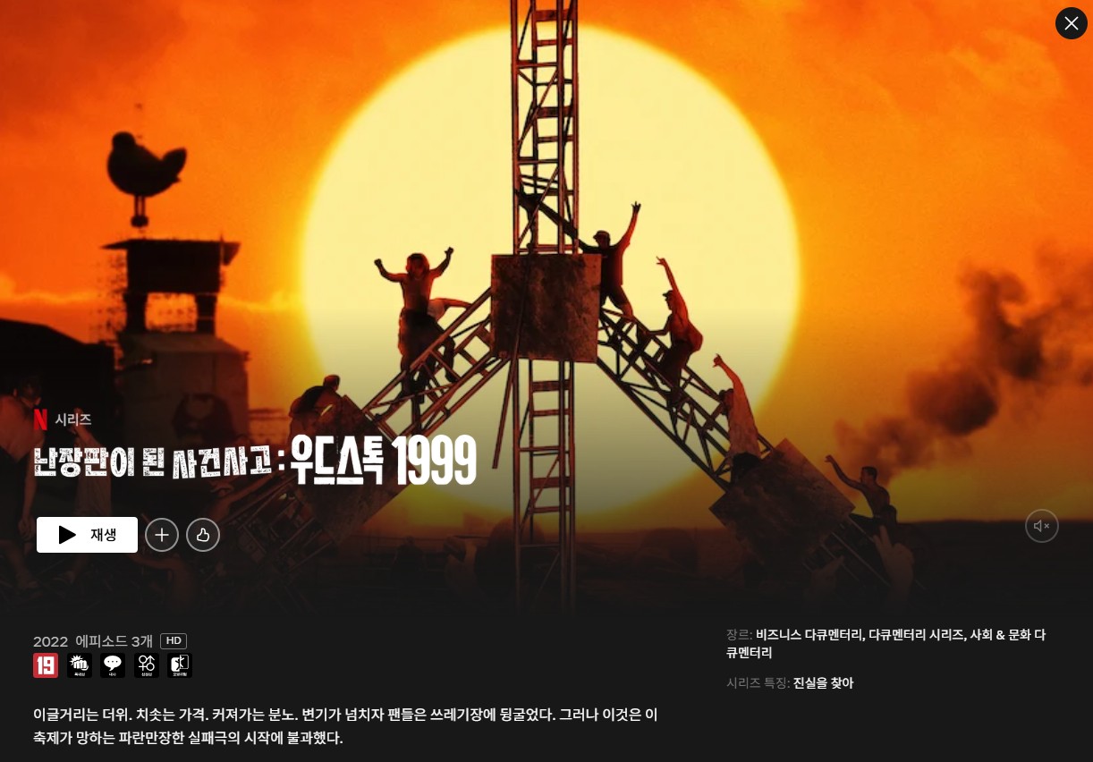 - 난장판이 된 사건 사고, 우드스톡1999 (Netflix, 2022): 히피 정신을 계승한다던 축제가 폭력과 혼돈으로 물든 실체를 추적.