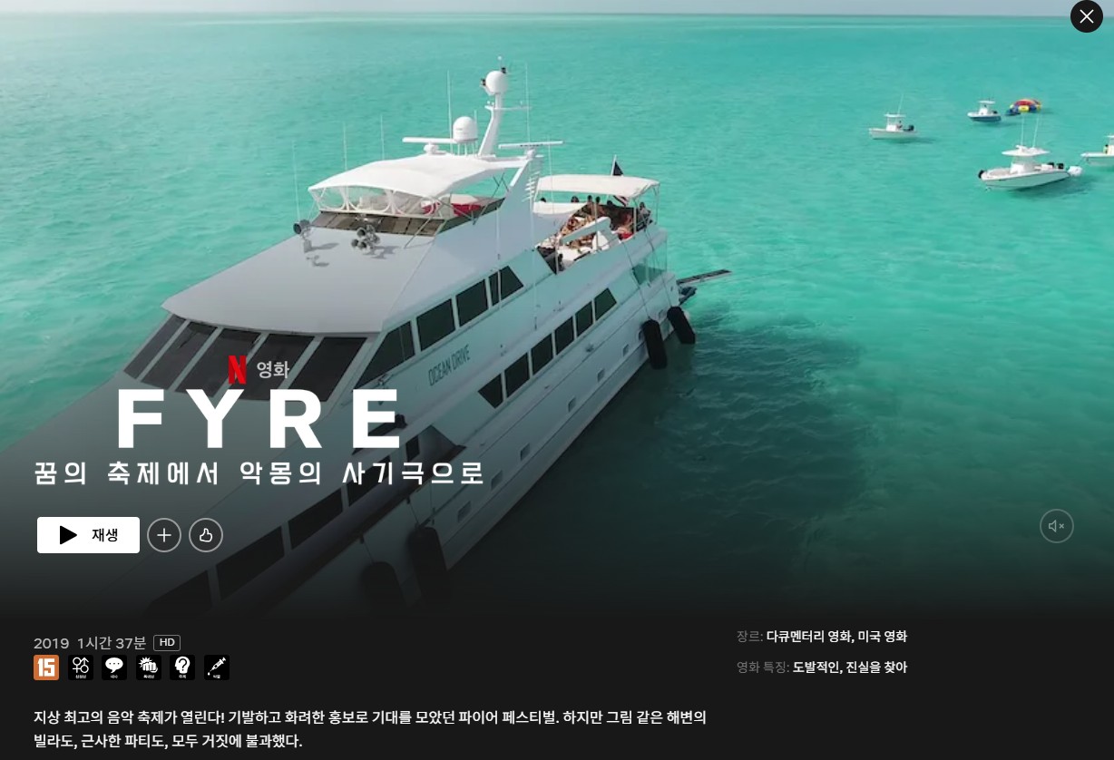 - FYRE, 꿈의 축제에서 악몽의 사기극으로 (Netflix, 2019): 럭셔리 페스티벌이 아닌 역사상 최악의 사기극으로 끝난 사건.