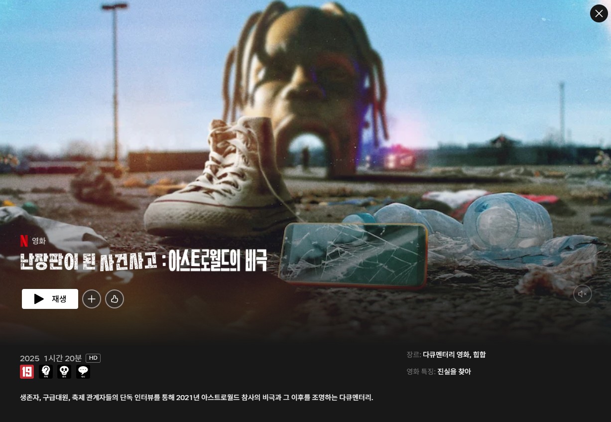 - 난장판이 된 사건 사고, 아스트로월드의 비극 (Netflix, 2025): 트래비스 스콧 공연 도중 발생한 압사 사고를 다룬 다큐.